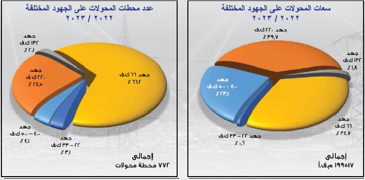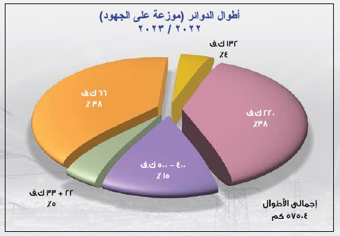 في 30 / 6/ 2023 بلغ إجمالي أطوال الدوائر )خطوط هوائية وكابلات( لشبكة نقل الكهرباء 57504 ألف كم مقارنة 56465 ألف كم في 30 / 6/ 2022 وبنسبة تطور 1.8 ٪.